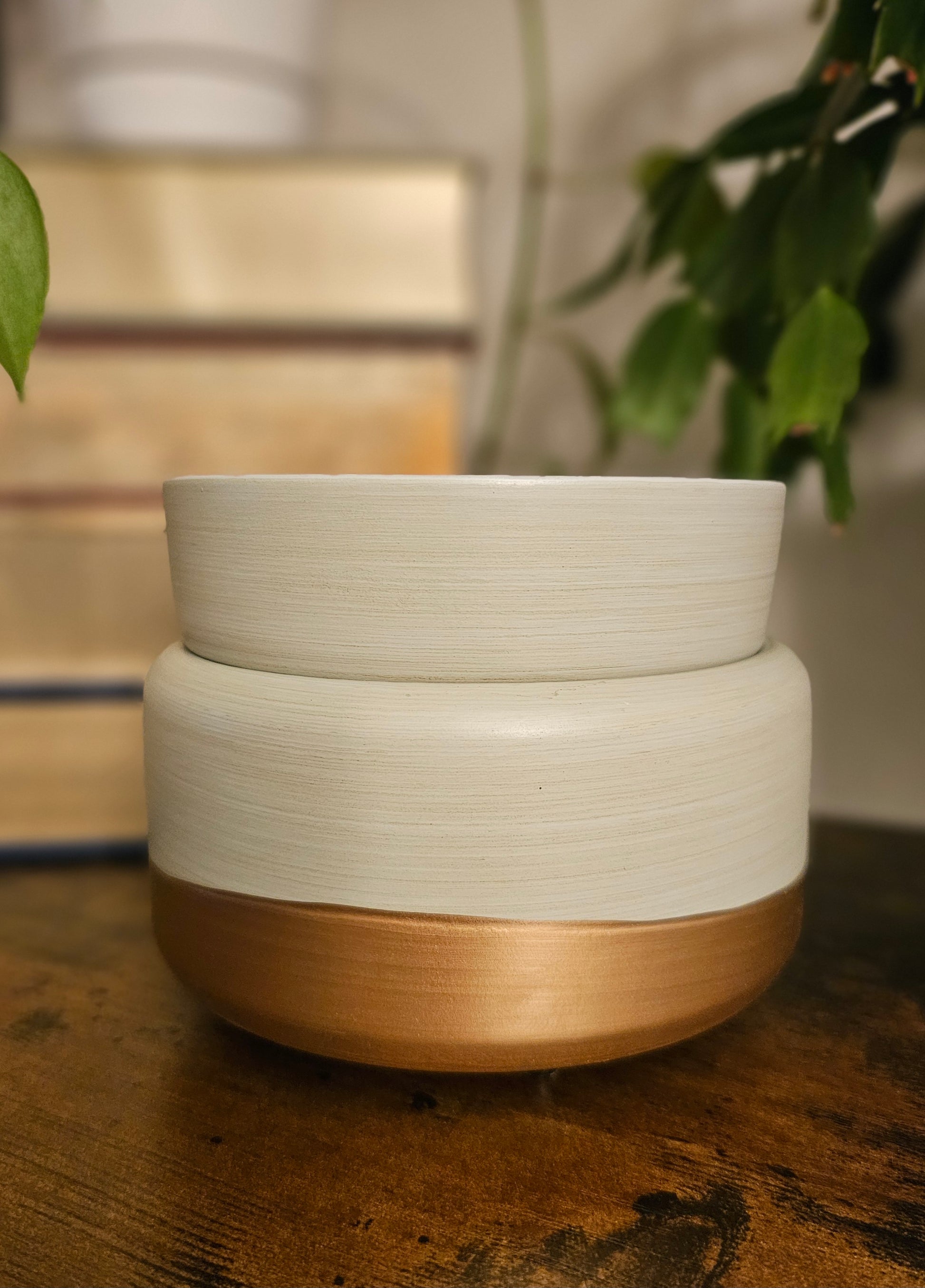 Grey, beige and green tones brushed together in a unique finish that is hand-applied, then dipped in gold, gives this warmer the Midas touch. Use the dish for use with your favorite wax melts or remove the dish to put a candle on the warming plate.